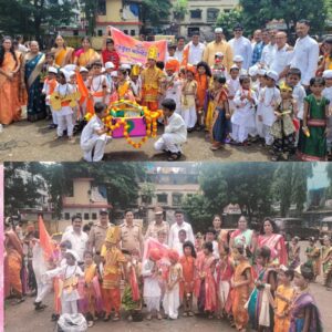 पारंपरिक वेशभूषा करून डोक्यावर तुळशी वृंदावन व हातात भगवी पताका घेऊन हरिनामाच्या गजरात विठू नामाचा जयघोष करीत चिमुकले वारकरी दिंडीत